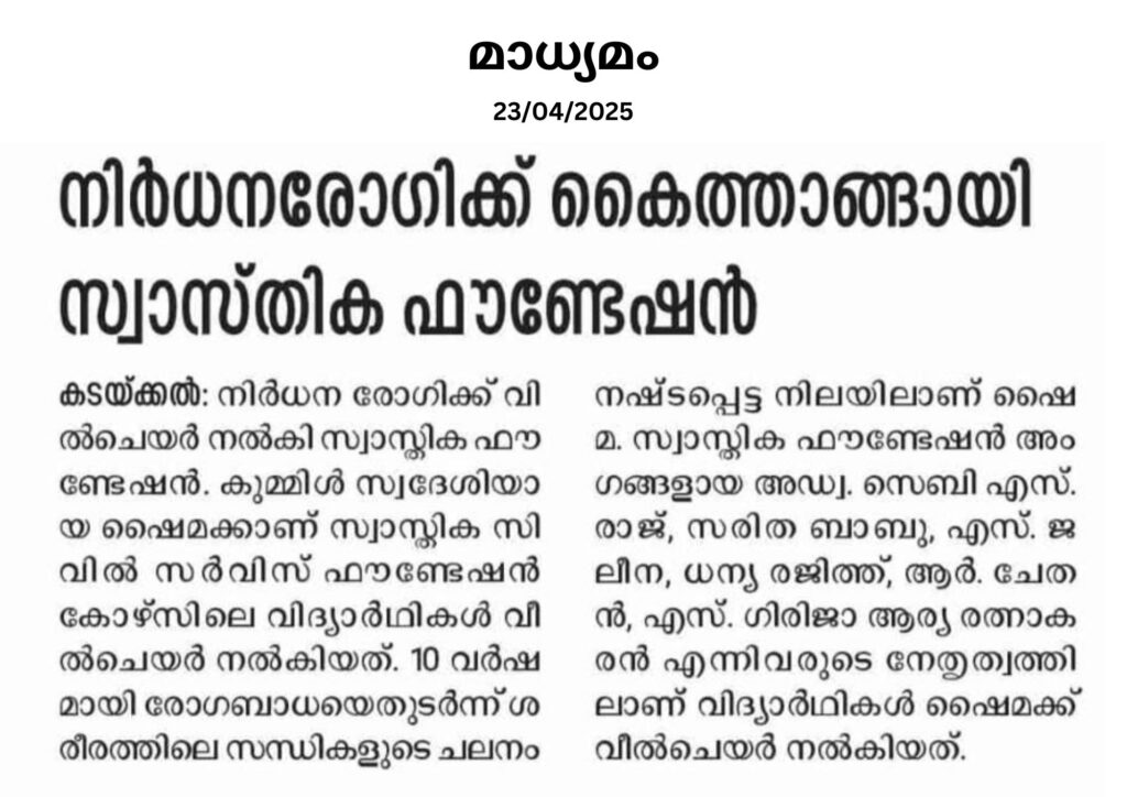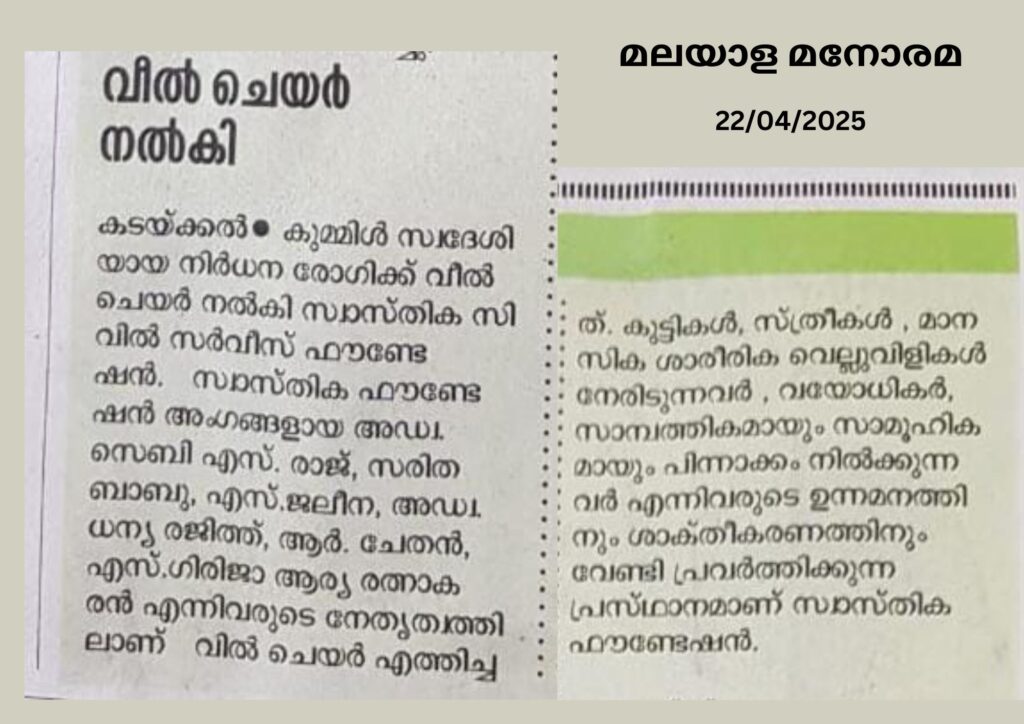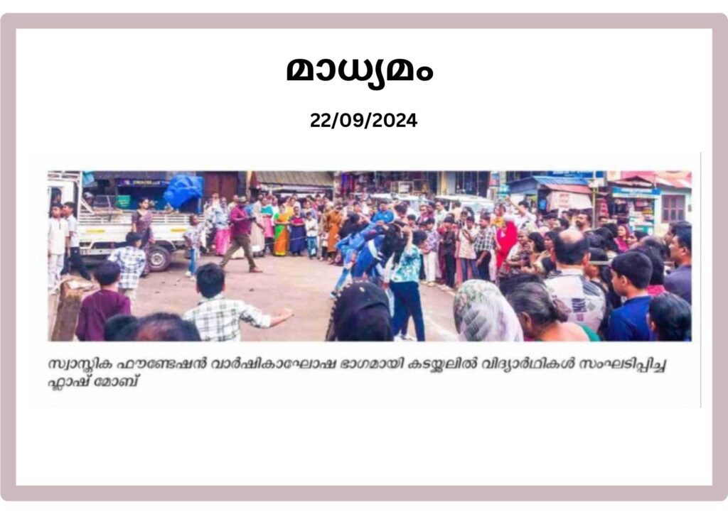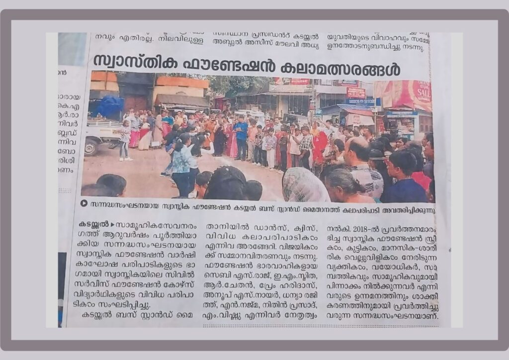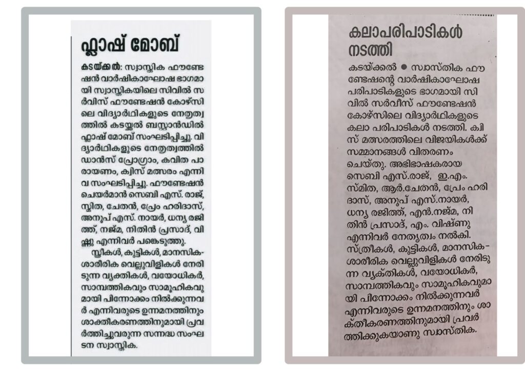 കൊല്ലം, കടയ്ക്കൽ ബസ് സ്റ്റാൻഡിൽ 20-09-2024 ന് നടന്ന സ്വാസ്തികയുടെ വാർഷികാഘോഷ പരിപാടിയുടെ പത്രവാർത്തകൾ.